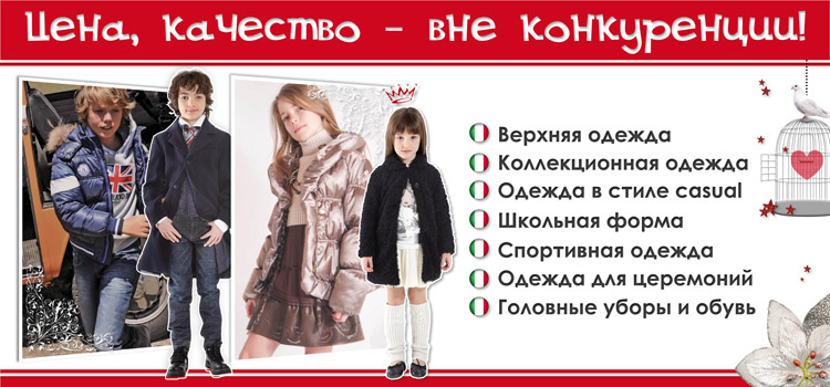 Функциональная, стильная одежда из Италии для мальчиков и девочек от 0 до 16 лет, ассортимент которой насчитывает несколько сотен моделей каждый сезон. Большой выбор спортивных костюмов и джинсов. Красивая подарочная упаковка.