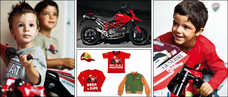 Куртки и джинсы, футболки от DUCATI – это спортивный стиль, яркие, контрастные краски, уверенные линии, удобство и эргономичность, подчеркивающие индивидуальность ребенка, придающие ему неповторимый шарм. Подросток в одежде от DUCATI – это победитель, но не агрессор. Он сильный, но не жестокий. Уверенный в себе, но не сноб. Это человек, чья жизнь есть движение к цели. Стремительное, рискованное и захватывающее.