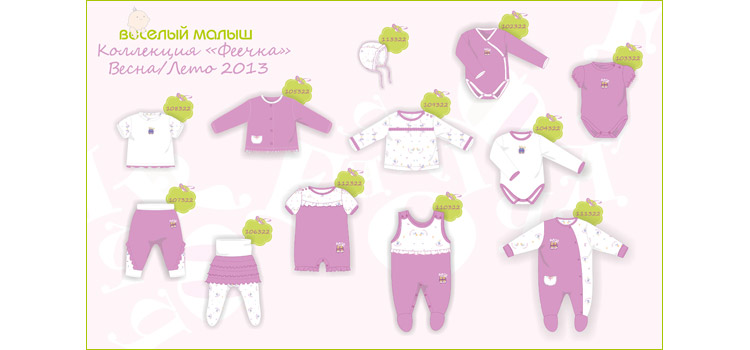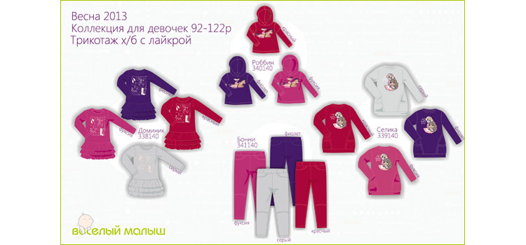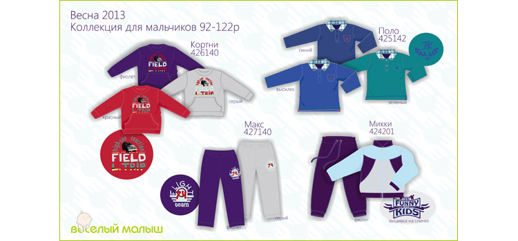 Российский производитель одежды для детей в возрасте от 0 до 7-ми лет. Торговая марка ВЕСЕЛЫЙ МАЛЫШ. В ассортименте - трикотажная одежды для новорожденных; бельевой трикотаж для мальчиков и девочек (майки, трусики, пижамы); верхний трикотаж для детей (платья, сарафаны, костюмы, жакеты).  Благодаря широкому ассортименту, богатой цветовой гамме и высокому качеству изделий, продукция марки ВЕСЕЛЫЙ МАЛЫШ уже более 10 лет пользуются стабильным спросом и нашла своих покупателей практически во всех регионах России.  Дизайнеры, конструкторы и технологи занимаются постоянным обновлением и расширением ассортимента продукции, делают ее еще более красивой и комфортной. Компания ориентирована на изготовление качественной и недорогой продукции, которая была бы доступна большинству покупателей.  Производитель: Компания ВЕСЕЛЫЙ МАЛЫШ