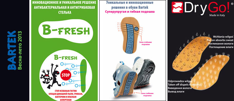 ° Компания BARTEK предлагает своим клиентам инновационные и уникальные решения. Во-первых, антибактериальную и антигрибковую стельку. Новая стелька выполняет функцию встроенного дезодоранта - эффективно предотвращает возникновение неприятного запаха в обуви.